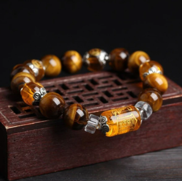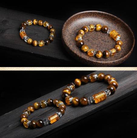 Essa é uma pulseira feita a mão com Pedra Olho de Tigre e Cristais de Ágata Amarela. Uma peça importada diretamente dos templos chineses pode atrair uma vida cheia de abundância e prosperidade.